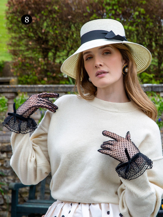 2. Caroline, Damen gepunktete Tüllhandschuhe mit doppeltem Bündchen und Schleife in Schwarz
